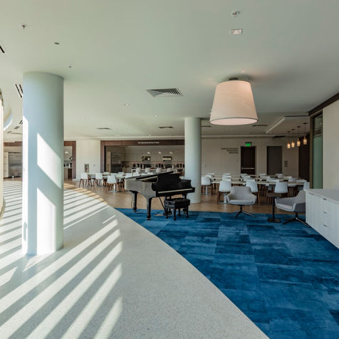 A sophisticated building management system controls lighting, temperature, and air quality based on real-time data. This provides optimal comfort to both guests and staff and minimizes energy wastage. The building includes a fitness center, as well as a meditation room, and a quiet day room. These spaces cater to the physical and mental health of the guests, promoting a balanced lifestyle. The open dining and kitchen areas, as well as the first-floor family room and second/third-floor dayrooms, host communal spaces for the guests to gather, fostering a sense of community. Encouraging interaction among guests will help enhance their overall quality of life. The dining room, among other locations throughout the facility, offers the option for chairs with and without arms that will meet and support the guests where they are in their size and needs as they are undergoing treatment. Overall, the new facility provides a light-filled, home-like environment through the mix of warm, natural, and inviting finish selections, along with versatile spaces throughout to accommodate each person's needs.