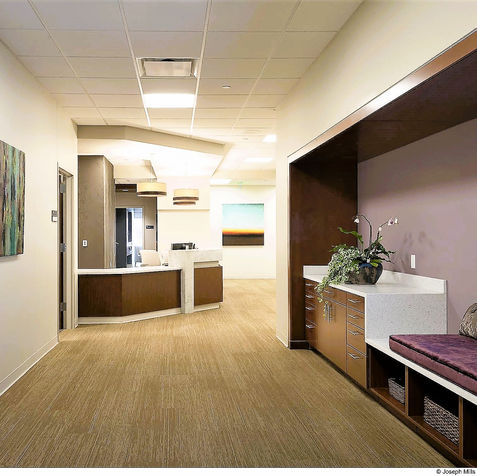 The main design goals of the clinic are convenience and hospitality. There is a "no waiting" policy, thereby eliminating the ubiquitous waiting room from the architectural program. There are a total of six care suites including two designated as specialty suites that are adaptable for future services. Each suite is 200 square feet with a consultation area that is separated from the exam area via a decorative curtain.