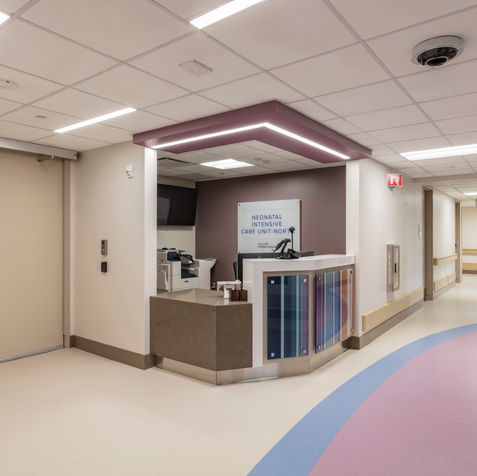 The project was originally planned as a renovation of the hospital’s existing small human milk lab that the hospital had outgrown. However, with the Le Norman family’s donation, the hospital could realize its goal of creating an expanded nutrition center to serve the entire hospital. Miles worked closely with hospital leadership and staff to identify prime space in the north NICU Village and developed a plan to reconfigure the core/support spaces for the NICU Village patient unit. This required redesigning the nurse station and selecting finishes in line with the hospital’s branding standards previously established by the Miles Team. New flooring, ceilings, and corridor lighting were all part of the overall finishes package. Another significant component of the new center is the human milk analyzer which determines how and to what extent milk must be fortified to meet specific nutritional needs.
